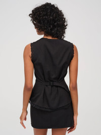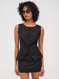 A love letter to the timeless Tropezienne style of Brigitte Bardot–the Shawna black mini skirt is the perfect balance of chic and sleek. This low-waisted mini skirt features princess darts in front and back for a flattering and a fitted silhouette. Style Notes - Fully lined - Invisible zipper at left waist Fabric + Care - Crafted in 65% polyester, 25% rayon, 10% wool - Lining is made of 100% cotton - Dry clean only