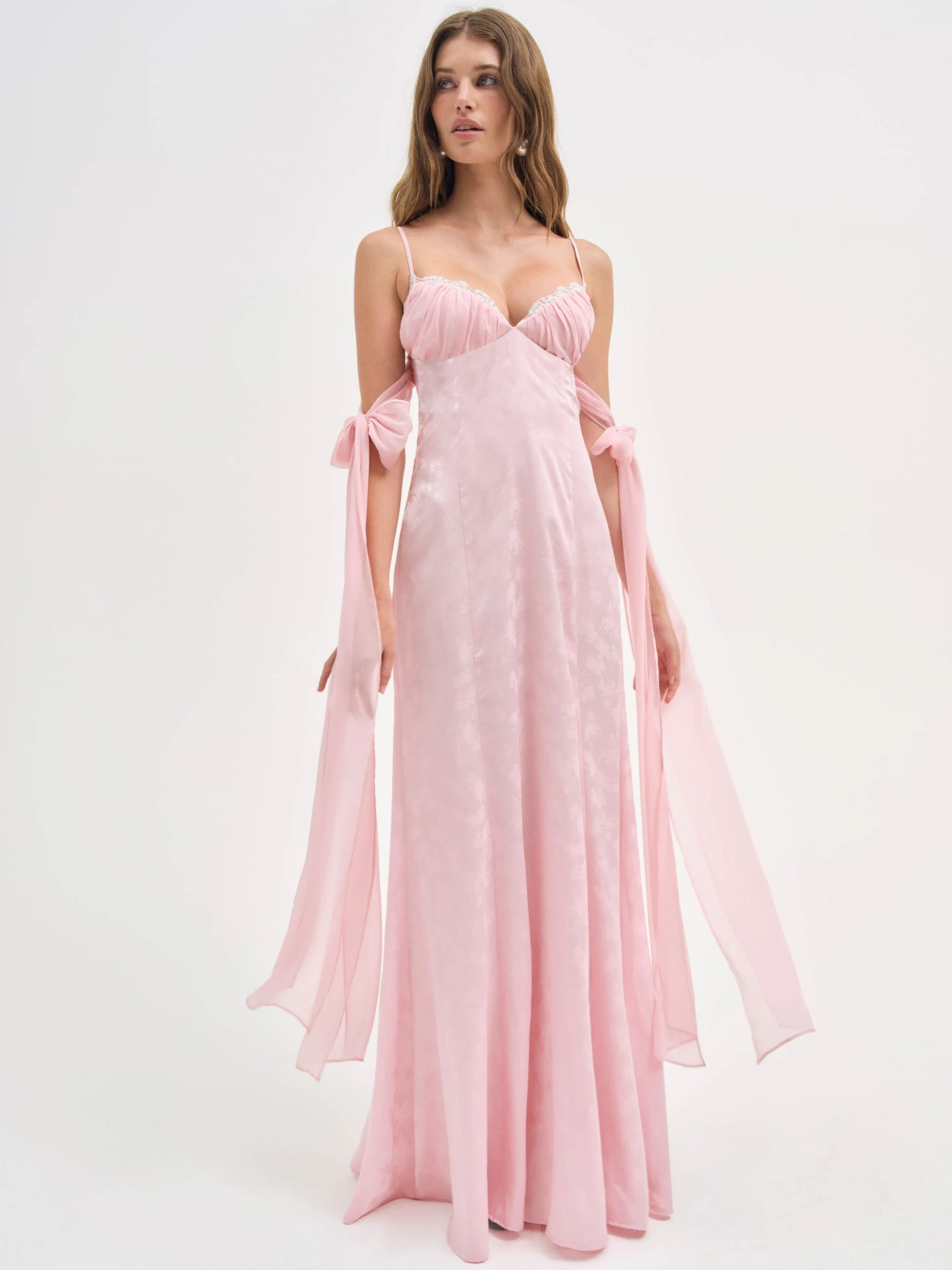 Embrace a Riviera summer romance with the Sheila off-the-shoulder maxi dress–an ultra-feminine floral printed jacquard pink maxi dress with a flattering mermaid silhouette and tying off-the-shoulder straps. Fit Notes - True to size Style Notes - Unlined - Bra clasp at center-back - Adjustable shoulder straps - Invisible zipper at center-back Fabric + Care - Crafted in 96% polyester, 4% spandex - Contrast is made of 100% polyester - Dry clean only