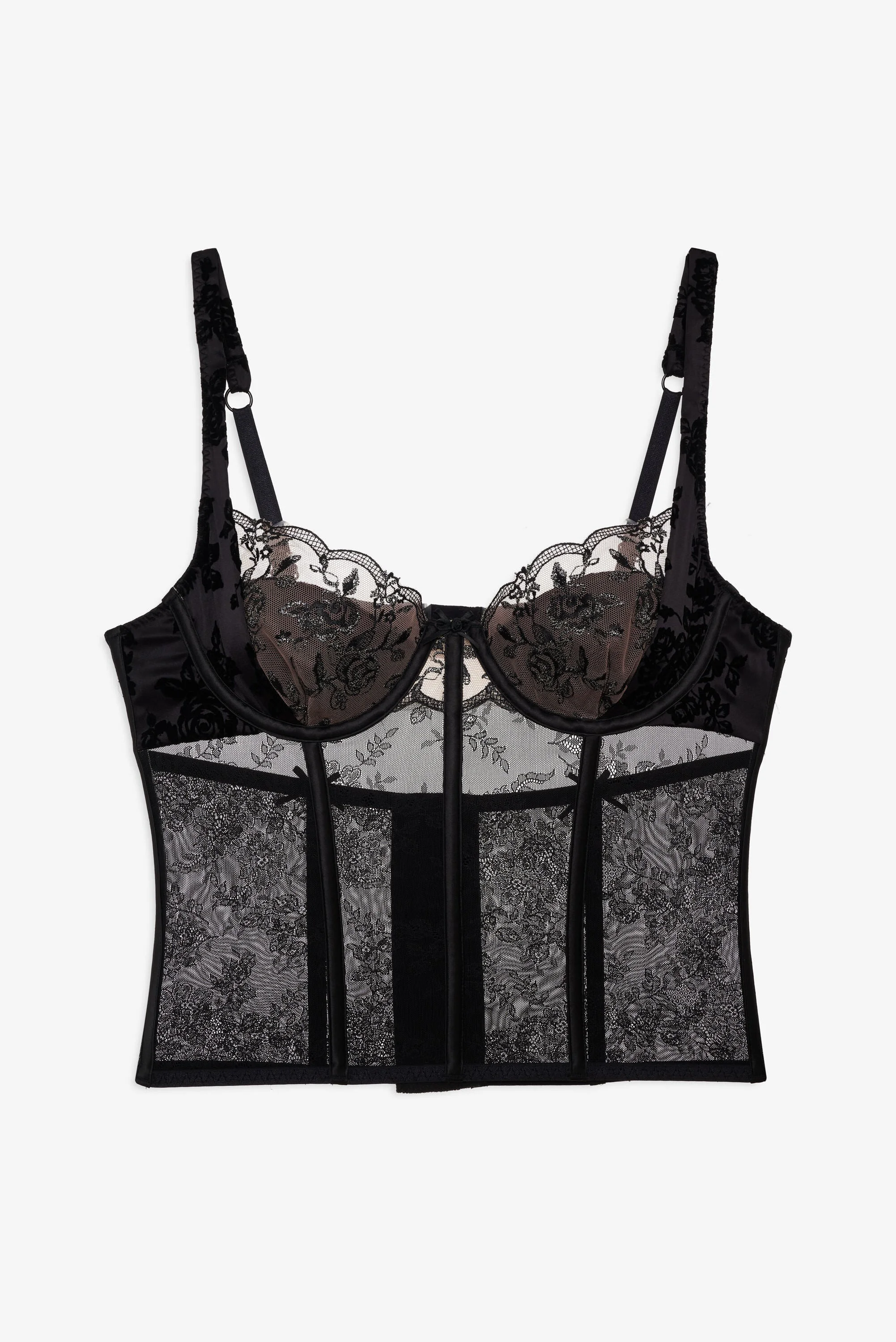 Turn heads beyond the bedroom in the Sonia black bustier—a sexy bustier top crafted in jacquard and lace, featuring underwire cups with a jacquard sling, a fully boned bodice, and decorative bows and rosettes. Style Notes - Cup lining only - Decorative elastic - Adjustable shoulder straps - 3-row hook and eye closure Fabric + Care - Crafted in 78% polyamide, 22% elastane - Lace is made of 100% polyester - Embroidery is made of 95% polyester, 5% metallic fiber - Strap is made of 92% polyester, 8% elastane - Hand wash cold - Only non-chlorine bleach - Do not wring or twist - Line dry - Do not iron - Do not dry clean