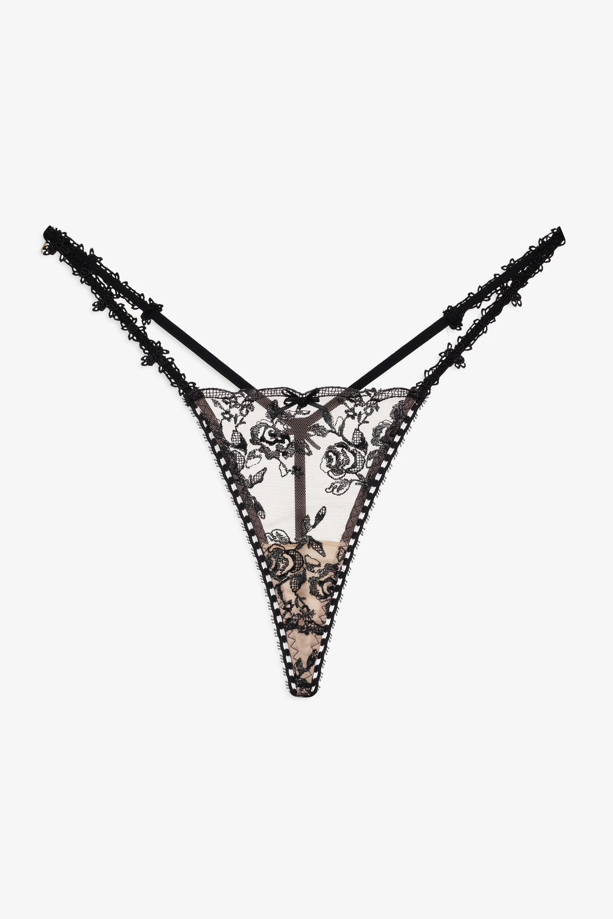 Embrace your dark side with the Sonia black g string panty. Featuring rose embroidery and rosette lace trims, this sexy string panty is finished with skinny ribbon bows and rosettes. Pair it with the Sonia Underwire Bra and Garter Belt for the complete lingerie set. Style Notes - Unlined - Decorative elastic Fabric + Care - Crafted in 100% polyester - Embroidery is made of 95% polyester, 5% metallic fiber - Gusset is made of 100% modal - Hand wash cold - Only non-chlorine bleach - Do not wring or twist - Line dry - Do not iron - Do not dry clean