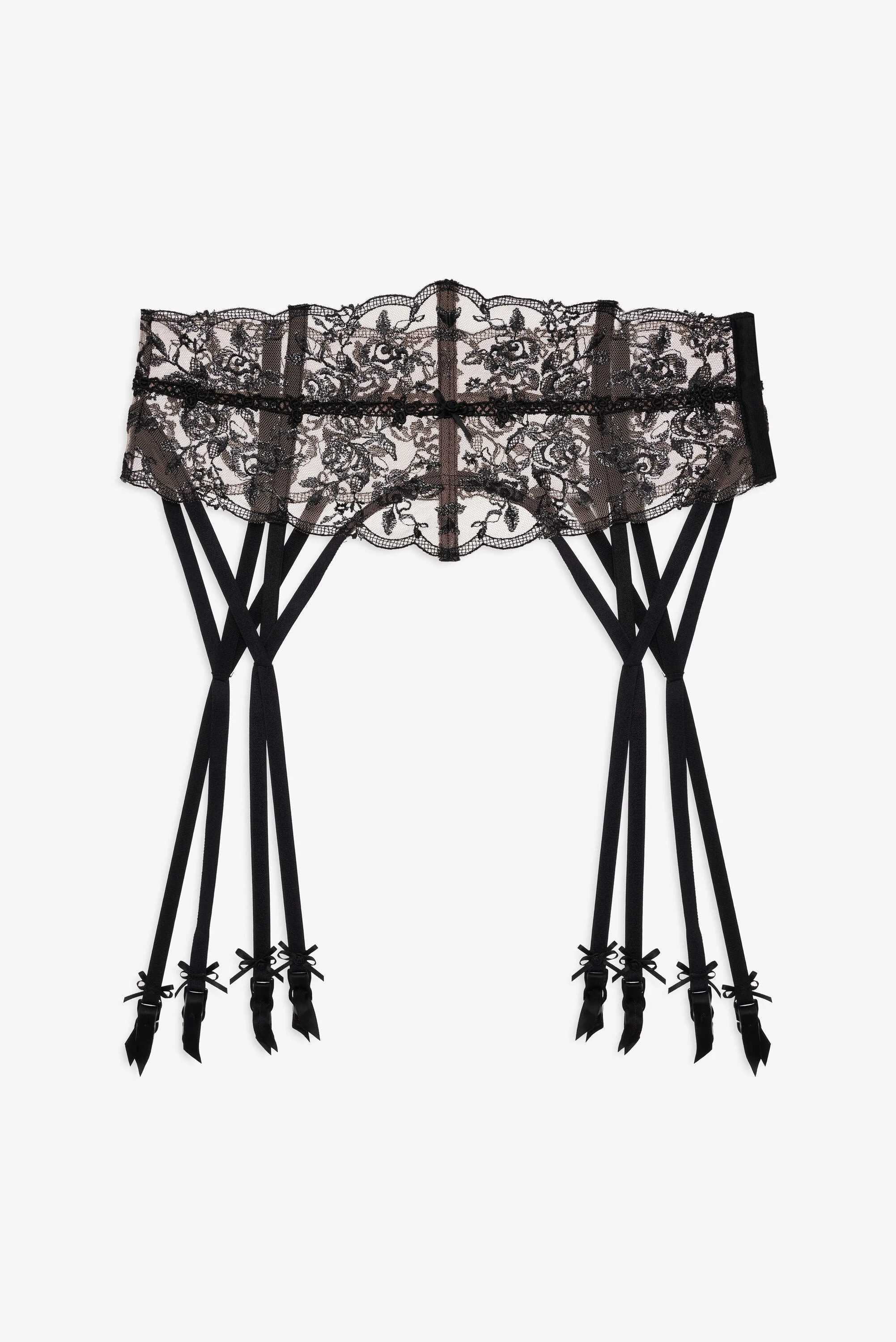 Embrace your dark side with the Sonia black garter belt—a lace garter with beautiful rose embroidery, rosette lace trims, and skinny ribbon bows with rosettes. Match it to the Sonia Underwire Bra and Double Layer Thong Panty for the complete lingerie garter set. Style Notes - Unlined - Thong back coverage - Decorative elastic - Keyhole details at front and back Fabric + Care - Crafted in 100% polyester - Embroidery is made of 95% polyester, 5% metallic fiber - Hand wash cold - Only non-chlorine bleach - Do not wring or twist - Line dry - Do not iron - Do not dry clean