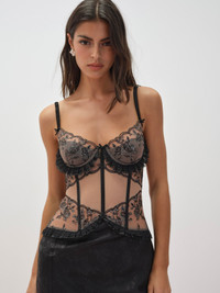 Turn heads beyond the bedroom in the Sonia black maxi dress—a seductive slip dress crafted in a silky jacquard, featuring underwire cups, a boned bodice, and a thigh-high slit. This black nightgown is adorned with rose embroidery, rosettes, and skinny ribbon bows. Style Notes - Cup lining only - Ruffled lace trims - Adjustable shoulder straps - Back bodice 3-row hook and eye closure - Invisible zipper at the left side seam Fabric + Care - Crafted in 97% polyester, 3% elastane - Lace is made of 100% polyester - Embroidery is made of 95% polyester, 5% metallic fiber - Mesh #1 is made of 100% recycled polyester - Mesh #2 is made of 88% polyamide, 12% elastane - Hand wash cold - Only non-chlorine bleach - Do not wring or twist - Line dry - Do not iron - Do not dry clean