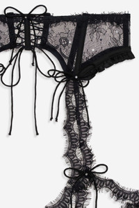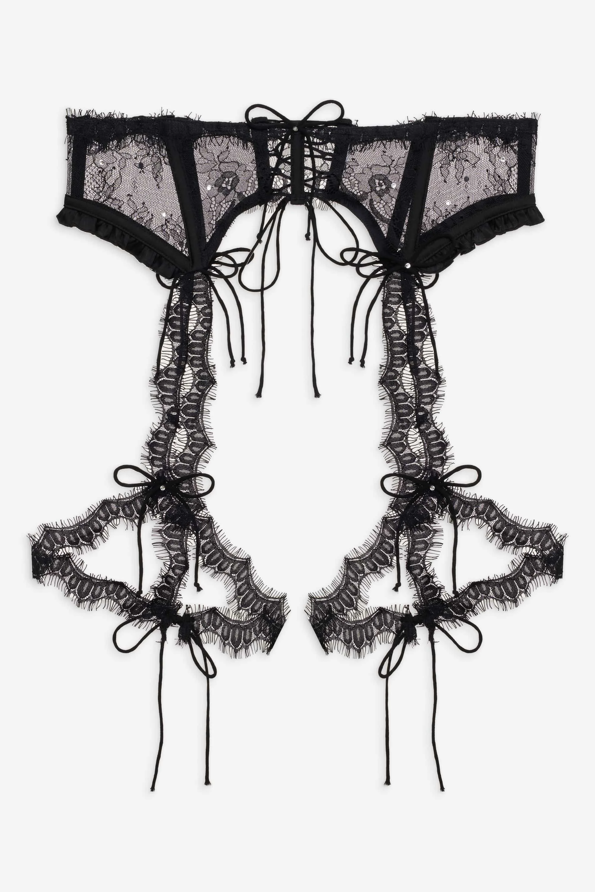 Ultra-timeless and seductive, the Sonja black garter belt is a sexy addition to your Sonja lingerie garter set. With rhinestones scattered throughout, this garter is completed with a scalloped lace trim and fixed skinny bows. Style Notes - Unlined - Function ties at the center-back and thigh straps Fabric + Care - Crafted in 100% polyamide - Hand wash cold, do not wring or twist - Line dry only