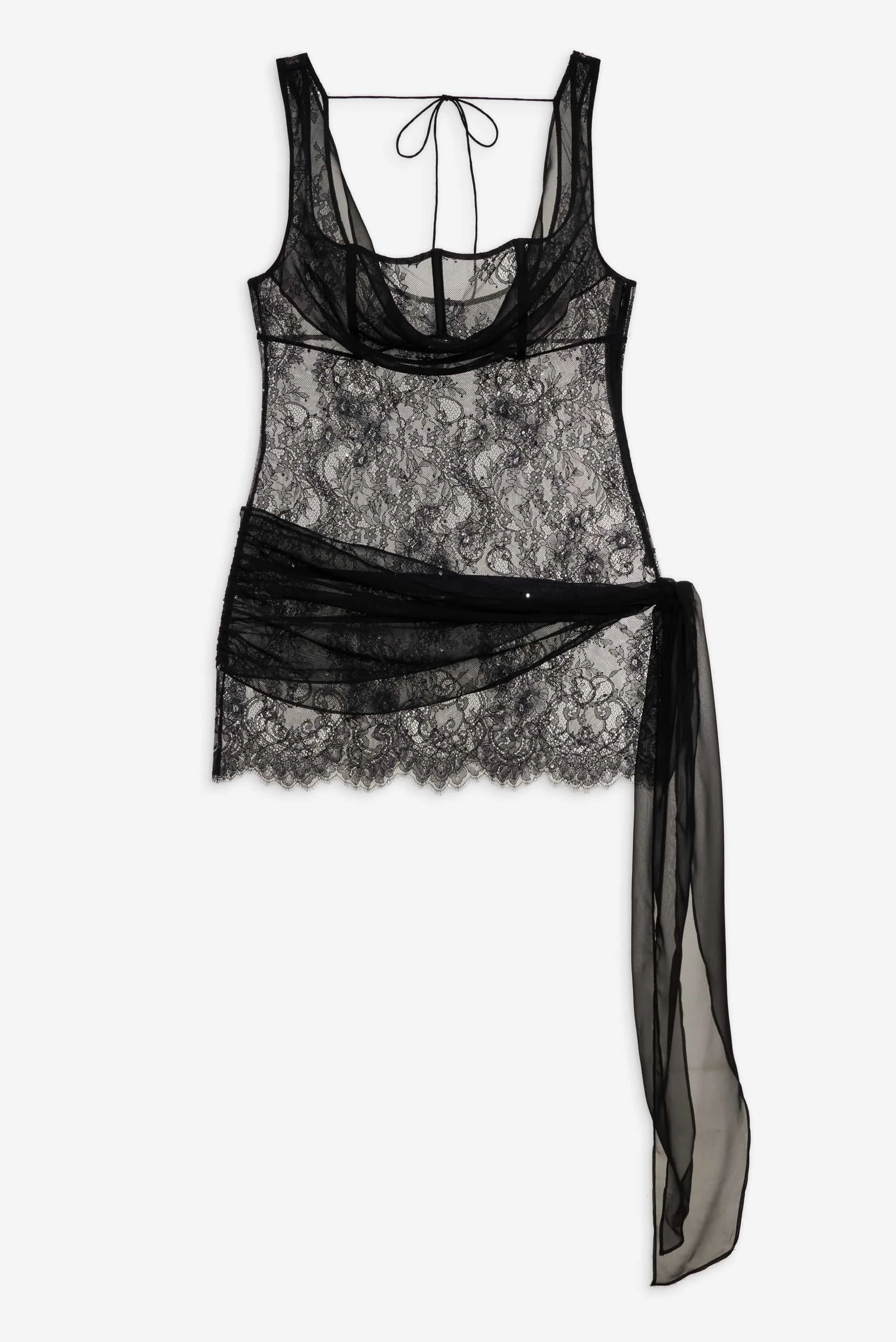 Designed for the romantic who craves the spotlight, the Sonja black slip dress is an ultra-sexy mini slip for evenings in—or out. Adorned with scattered rhinestones throughout, this sheer lace mini dress features a chiffon cowl neckline, a functional sash draped over the hip, and a scalloped-edge hem. Style Notes - Unlined - Boned bust panel - Functional back shoulder tie - Invisible zipper at the center-back Fabric + Care - Crafted in 100% polyamide - Mesh is made of 100% polyester - Hand wash cold, do not wring or twist - Line dry only