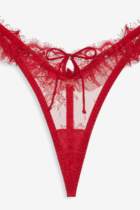 Designed for the sultry Muse, the Sonja red thong is both elegant and seductive. Decorated with allover scattered rhinestones, this g string is finished with skinny bows, a scalloped lace trim, and a tulle hip ruffles. Pair it with the Style Notes - Unlined Fabric + Care - Crafted in 100% polyamide - Gusset is made of 100% modal - Hand wash cold - Only non-chlorine bleach - Do not wring or twist - Line dry - Do not iron - Do not dry clean