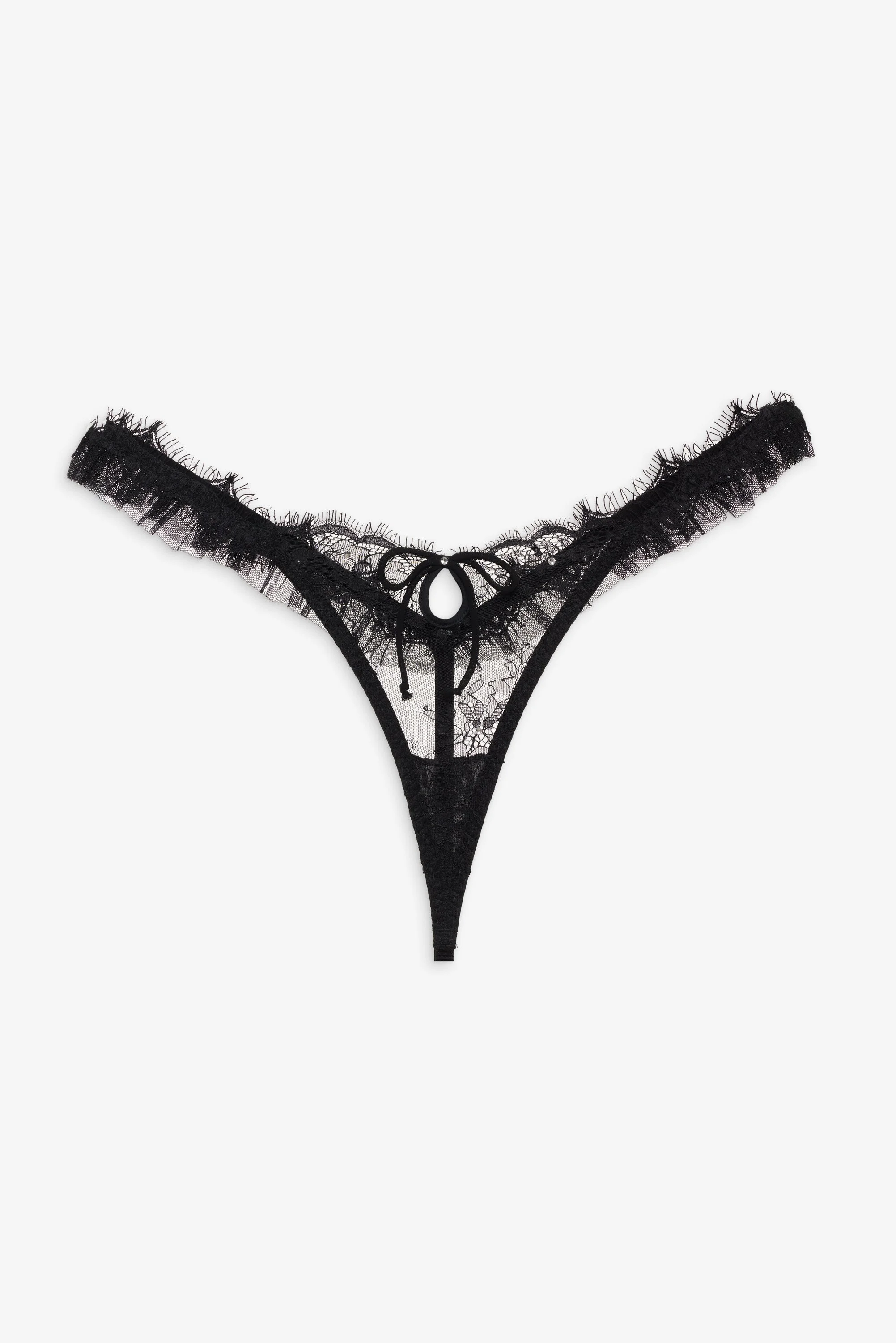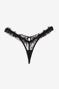 Designed for the sultry Muse, the Sonja black thong is both elegant and seductive. Decorated with allover scattered rhinestones, this g string is finished with fixed skinny bows, a scalloped lace trim, and a tulle hip ruffles. Pair it with the Sonja Underwire Bra for a matching lingerie set. Style Notes - Unlined Fabric + Care - Crafted in 100% polyamide - Gusset is made of 100% modal - Hand wash cold, do not wring or twist - Line dry only
