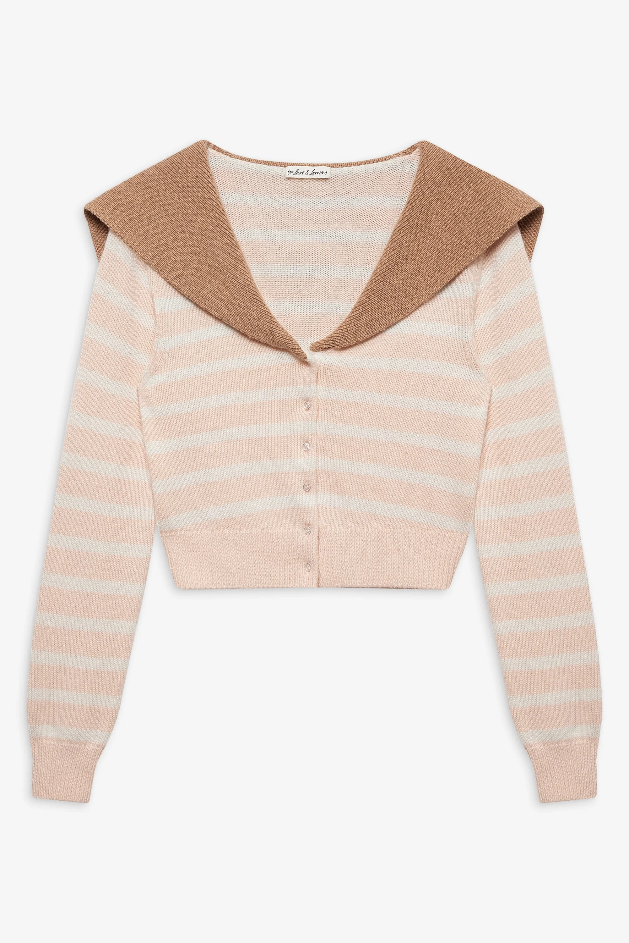 Inspired by iconic vintage silhouettes, the Sophia Stripe pink cardigan revives the fresh, preppy style of eras past. This cropped striped cardi spotlights a contrast camel sailor style collar and rib finishes at the cuffs and hem. Style Notes - Unlined - Functional button at the center-front Fabric + Care - Crafted in 50% nylon, 40% viscose, 5% cashmere, 5% wool - Dry clean only