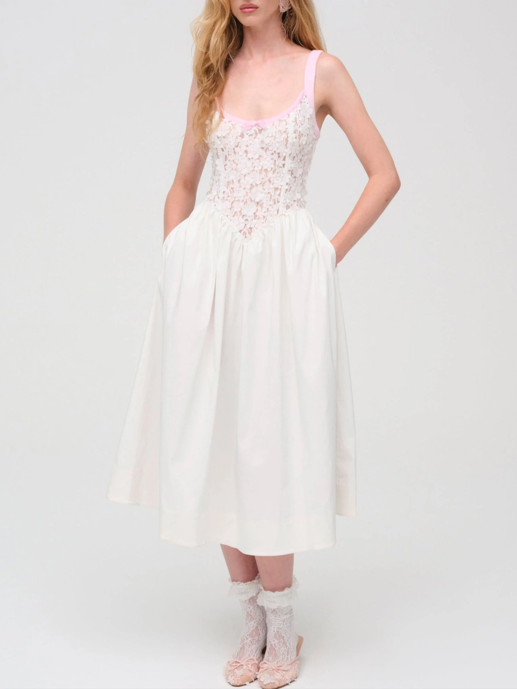 Make a chic, off-beat statement in the Blossom lace midi dress–a fitted basque waist dress crafted in a delicate stacked blossom lace and a solid contrast gathered skirt. Adorned with contrast pink denim bindings, this white midi dress features a built-in panty lining, and functional side pockets. Style Notes - Panty lining only - Functional back shoulder tie - Exposed metal zipper at center-back Fabric + Care - Crafted in 50% polyamide, 50% polyester - Lining is made of 80% polyamide, 20% spandex - Contrast is made of 100% cotton - Dry clean only