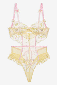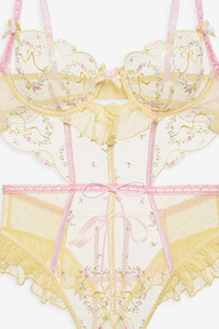 Celebrate the art of feminine charm in the Sunny Bouquet yellow teddy–a thong bodysuit adorned with floral heart and bow embroidery, an elegant slotted ribbon trim, and tiered mesh ruffles at the hips and center-front gore. Spotlighting rosette topped bow appliques and a low open back, this lingerie bodysuit was designed for basking in sunlit gardens. Style Notes - Unlined - G-string panty coverage - Adjustable shoulder straps - Functional ribbon tie at waist - Bra hook and eye closure at center-back Fabric + Care - Crafted in 100% recycled polyester - Embroidery is made of 100% polyester - Mesh is made of 82% polyamide, 18% elastane - Gusset is made of 100% modal - Hand wash cold - Do not wring or twist - Line dry - Do not dry clean