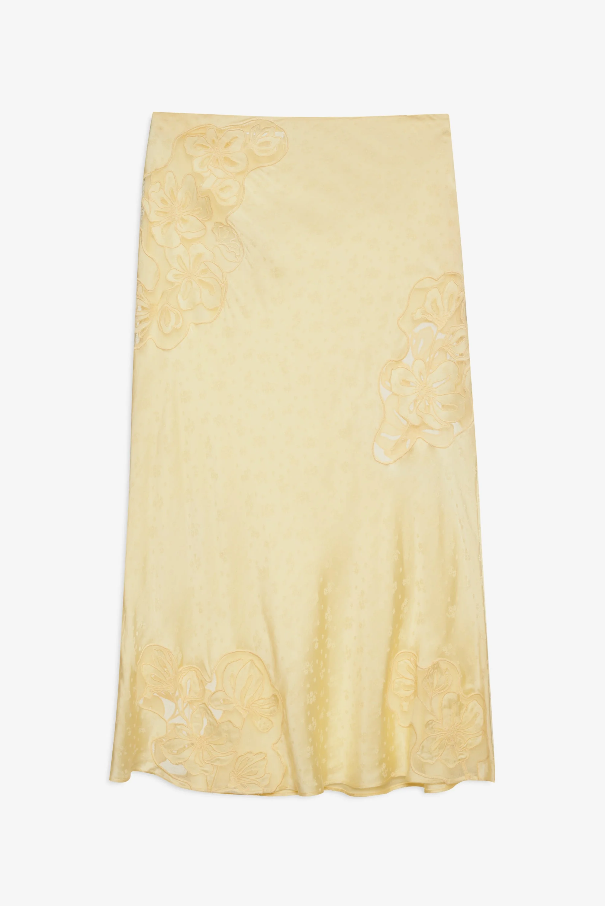 Featured in butter yellow—the hue of the summer—the Sunrise yellow midi skirt is cut to an effortless '90s silhouette with inset appliques. Wear this satin skirt to drinks at golden hour. Style Notes - Unlined - Invisible zipper at the side seam Fabric + Care - Crafted in 100 % viscose - Contrast is made of 100% nylon - Machine wash cold - Lay flat to dry - Cool iron ok - Ok to dry clean