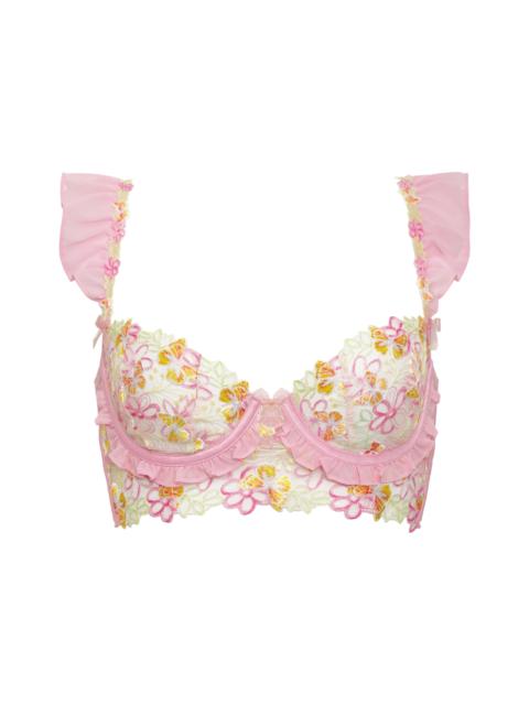 Fluttery chiffon ruffles pair perfectly with butterfly embroidery on this ultra-femme, cropped top. Style Notes - Lightly lined - Underwire - Back hook-and-eye closures - Ruffled adjustable straps and details - Cage-back styling - Organza bow accents - Partially made with recycled materials - Hand wash - Imported Fabric + CareSelf: 100% Recycled Polyester; Embroidery: 100% Polyester; Contrast: 100% Polyester Hand Wash Separately Air Dry With Care