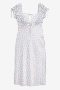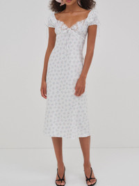 Inspired by heavenly European summers, the Sweet Escape white slip dress exudes timeless femininity. This printed satin midi dress spotlights triangle cups, a bias-cut skirt, and short puff sleeves. It's adorned with lace ruffles at the shoulders. Style Notes - Unlined - Functional keyhole and tie at the center-back Fabric + Care - Crafted in 100% polyester - Ruffle is made of 100% polyamide - Gusset is made of 100% modal - Hand wash cold - Only non-chlorine bleach - Do not wring or twist - Line dry - Do not iron - Do not dry clean