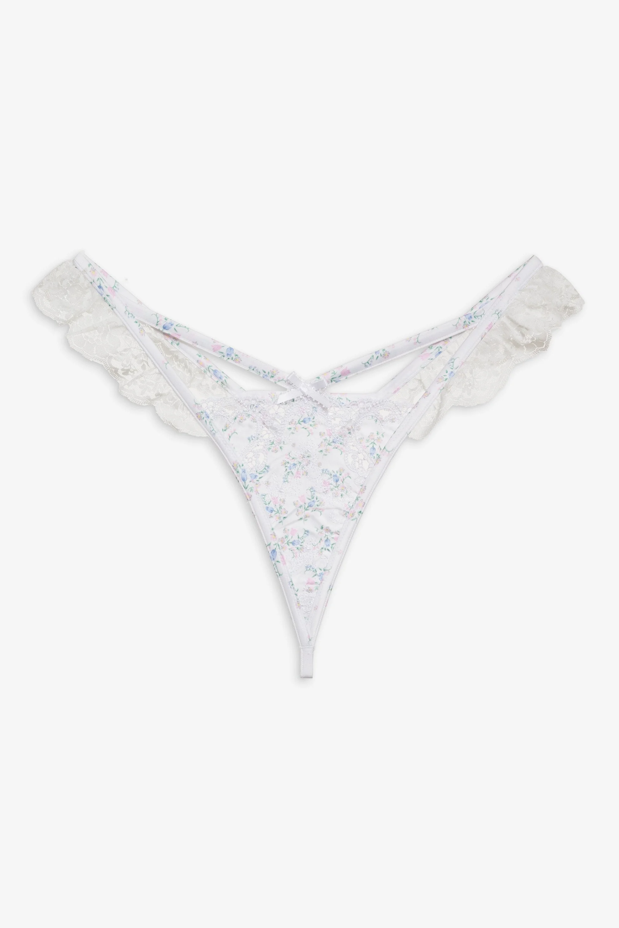 Inspired by heavenly European summers, the Sweet Escape white thong exudes timeless femininity. This embroidered g-string is crafted in a floral printed satin and features lace ruffles at the neckline and satin lingerie bows. Pair it with the Sweet Escape Underwire Bra for a co-ord lingerie set. Style Notes - Unlined Fabric + Care - Crafted in 100% polyester - Ruffle is made of 100% polyamide - Gusset is made of 100% modal - Hand wash cold - Only non-chlorine bleach - Do not wring or twist - Line dry - Do not iron - Do not dry clean