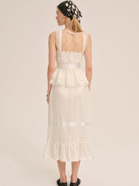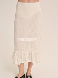 For a heat-soaked escape by the lake, The Sweet Summer white midi skirt is crafted in 100% cotton and ready for summer. This seersucker cotton midi skirt is adorned with a picot waistband, embroidered lace inset trims, and satin ribbon details throughout. Style Notes - Built-in panty lining - Invisible zipper at side seam Fabric + Care - Crafted in 100% cotton - Lining is made of 95% viscose, 5% spandex - Embroidery is made of 100% polyester - Machine wash cold - Gentle cycle - Lay flat to dry - Warm iron ok or dry clean