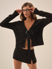 The ultra-feminine Tayla black cardigan will become a wear-on-repeat knitwear staple this winter. Crafted in a soft mohair, this bow cardigan is adorned with a single satin tie bow at the front neckline for a romantic look. Fit Notes - True to size Fabric + Care - Unlined - Fitted long sleeves - Tall rib panels