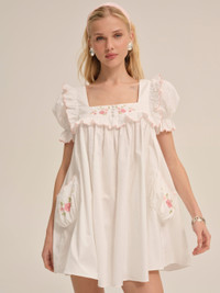 Inspired by 1950s silhouettes, the Tea Time white babydoll dress exudes vintage charm. Crafted in 100% cotton, this puff sleeve dress is adorned with floral embroidery, scalloped ruffled trim, and functional patch pockets. Fit Notes - True to size - Oversized fit Style Notes - Unlined - Elasticated puff sleeves Fabric + Care - Crafted in 100% cotton - Lining is made of 100% cotton - Dry clean only