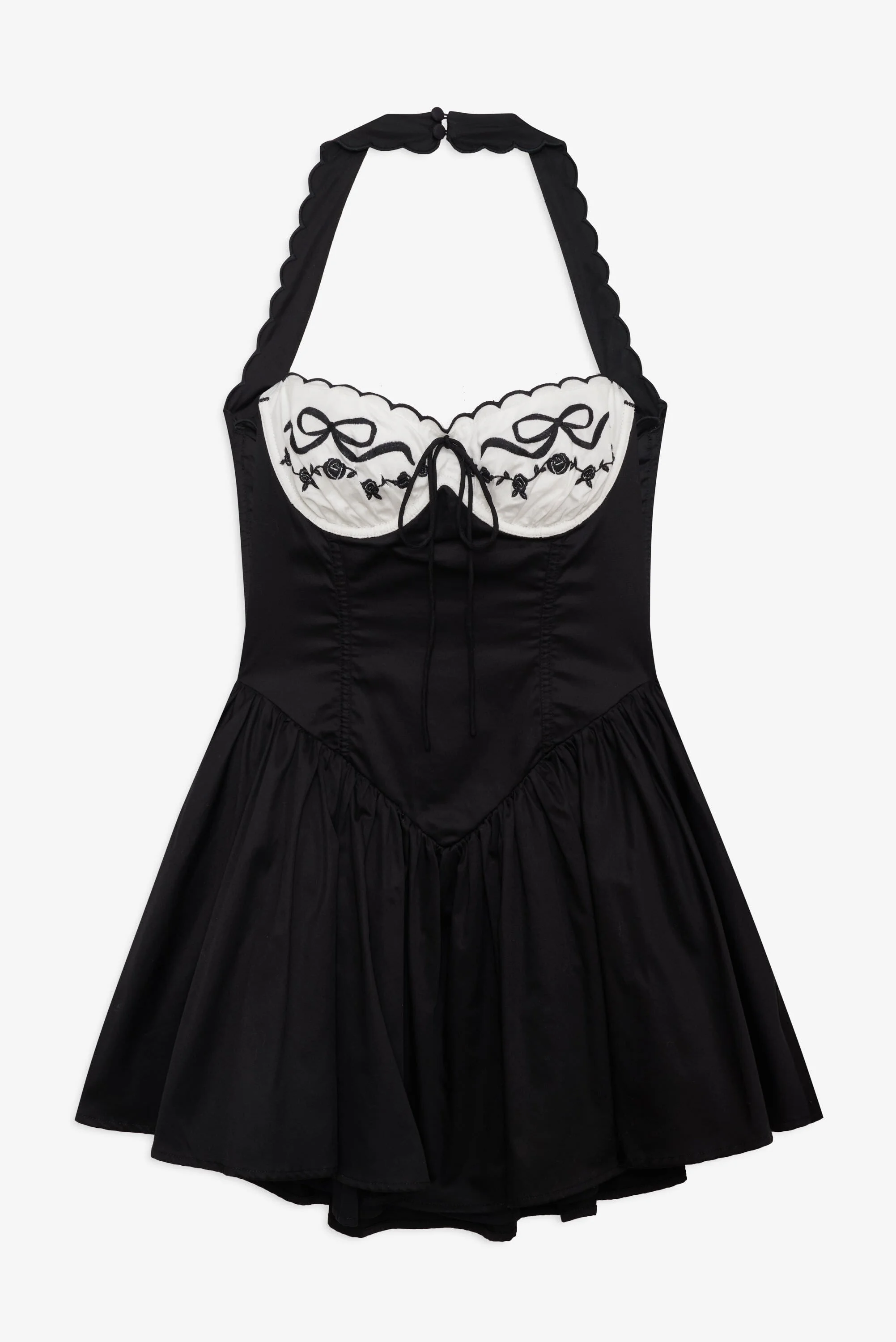 Embrace feminine ease and vintage-inspired details with the Tea Time Poplin bustier mini dress—crafted in a cotton poplin with decorative floral embroidery. This drop-waist mini dress features a boned corset bodice and is adorned with scallop trims, a halter neckline, and center-front bow. Fit Notes - True to size Style Notes - Pockets at side seams - Invisible zipper at center-back - Halter neck straps feature button closure Fabric + Care - Crafted in 100% cotton - Lining is made of 100% cotton - Dry clean only