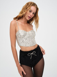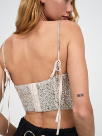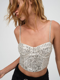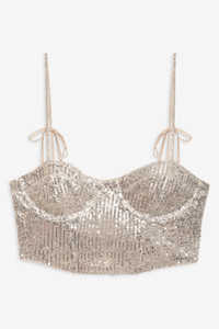 Be the star of sparkle season in the Tia silver top—a cropped sequin top with underwire cups, boning and rhinestone embellishments. This crop top ties at the back with satin ties.