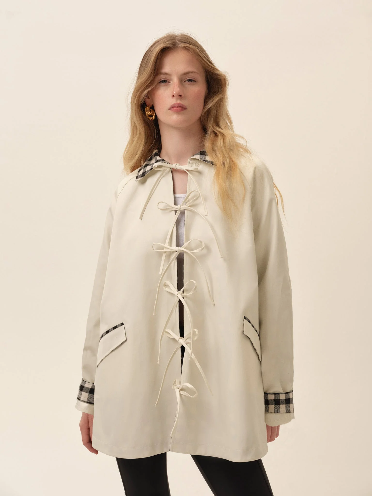 Refined and adaptable, this reversible trench coat pairs classic twill with playful gingham, made to move with the day and the weather. Style Notes - Solid on one side and printed gingham on the other - Small ties at center front closure - Welt patch pockets - Raglan sleeves with cuff belt detail Fabric + Care - Crafted in 60% cotton, 40% polyester - Lining is made of 63% polyester, 27% cotton, 10% rayon - Dry clean only