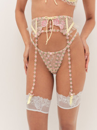 Spring garden reveries start with this yellow garter belt, crafted from tulle with whimsical twilight rose embroidery and floral trim. Complete the look with the Twilight Rose Thong Panty and Twilight Rose Underwire Bra. Style Notes - Twilight rose embroidered tulle garter belt - Tulle hip ruffle detailing - Embroidered floral trim - Organza lingerie bows with rosette accents - Functional garter clips - Functional center back tie - Unlined Fabric + Care - Crafted in 100% polyester - Ruffle is made of 100% polyamide - Hand wash cold - Only non-chlorine bleach - Do not wring or twist - Line dry - Do not iron - Do not dry clean