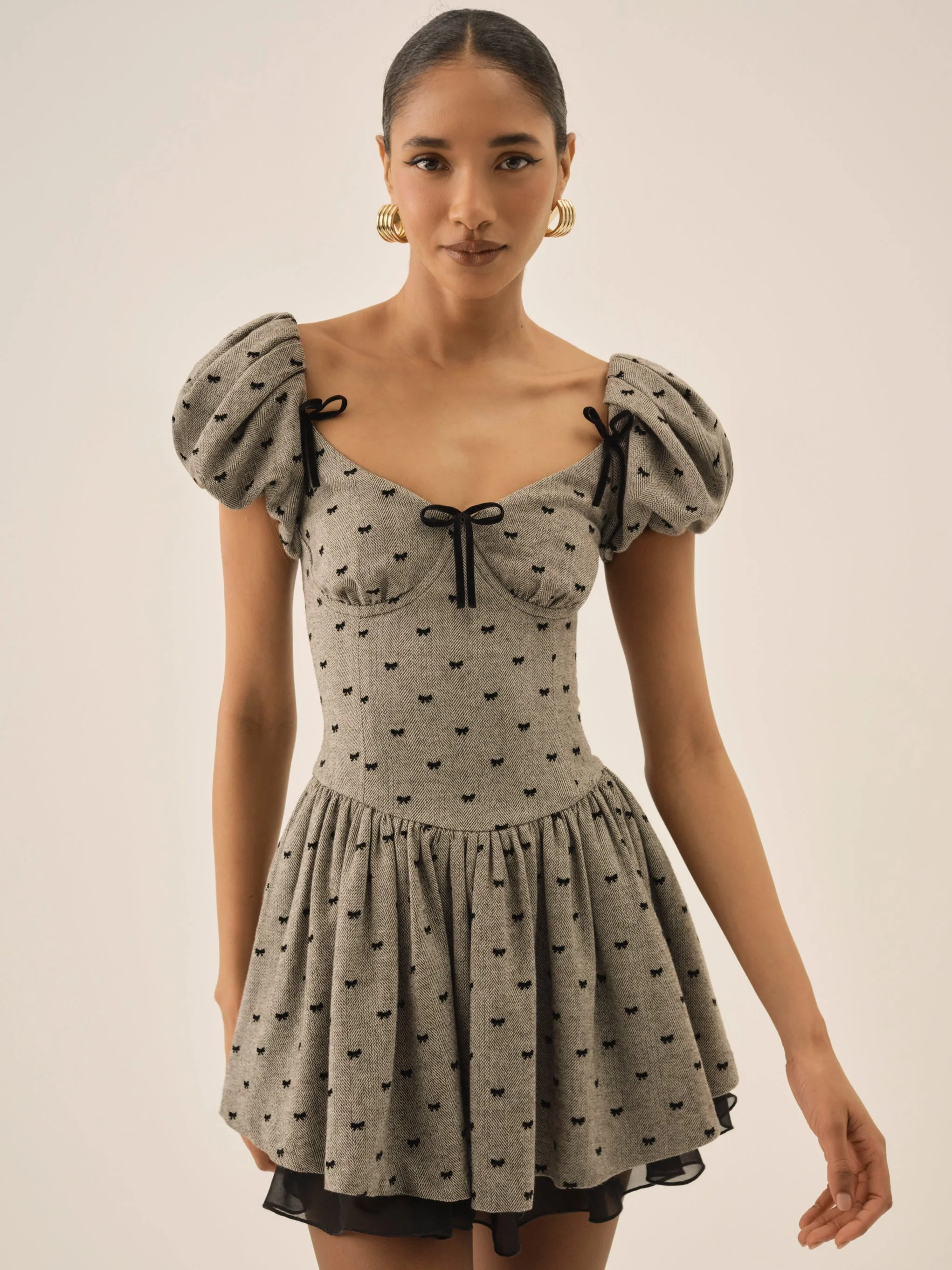 For a timeless yet celebratory look, the Twill bow mini dress charms with its flocked bow fabrication. This grey mini dress spotlights underwire cups, short puff sleeves and a drop waist. It's adorned with bows throughout. Style Notes - Fully lined - Gathered skirt - Invisible zipper at center-back with hook & eye closure Fabric + Care - Crafted in 80% polyester, 20% wool - Lining is made of 100% polyester - Dry clean only