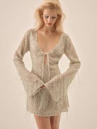 FOR LOVE & LEMONS KEEPSAKES: Let the evening light catch every step in the exquisite Twinkle Sequin silver mini dress. Crafted in semi-sheer chiffon, this delicate sequin dress spotlights a plunging neckline with center-front keyhole and tie, long bell shaped sleeves, and a fitted bodice. This beautiful party dress is finished with hand-beaded fringe details to create the illusion of falling snowflakes. Style Notes - Fully lined in chiffon - Darts at the waist - Invisible zipper at the side seams Fabric + Care - Crafted in 100% silk - Lining is made of 100% polyester - Dry clean only
