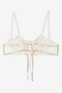 An ode to nostalgic lingerie of eras past–the Vintage Embroidery sheer bra exudes antique charm. Crafted in dainty tulle, this white bralette is adorned with heart shaped embroidered cups, decorative lace trims, functional satin lace-up ties at the center-front, and ribbon ties at the center-back. Style Notes - Tulle cup lining only Fabric + Care - Crafted in 100% polyamide - Trim is made of 100% polyester - Hand wash cold - Line dry - Do not dry clean