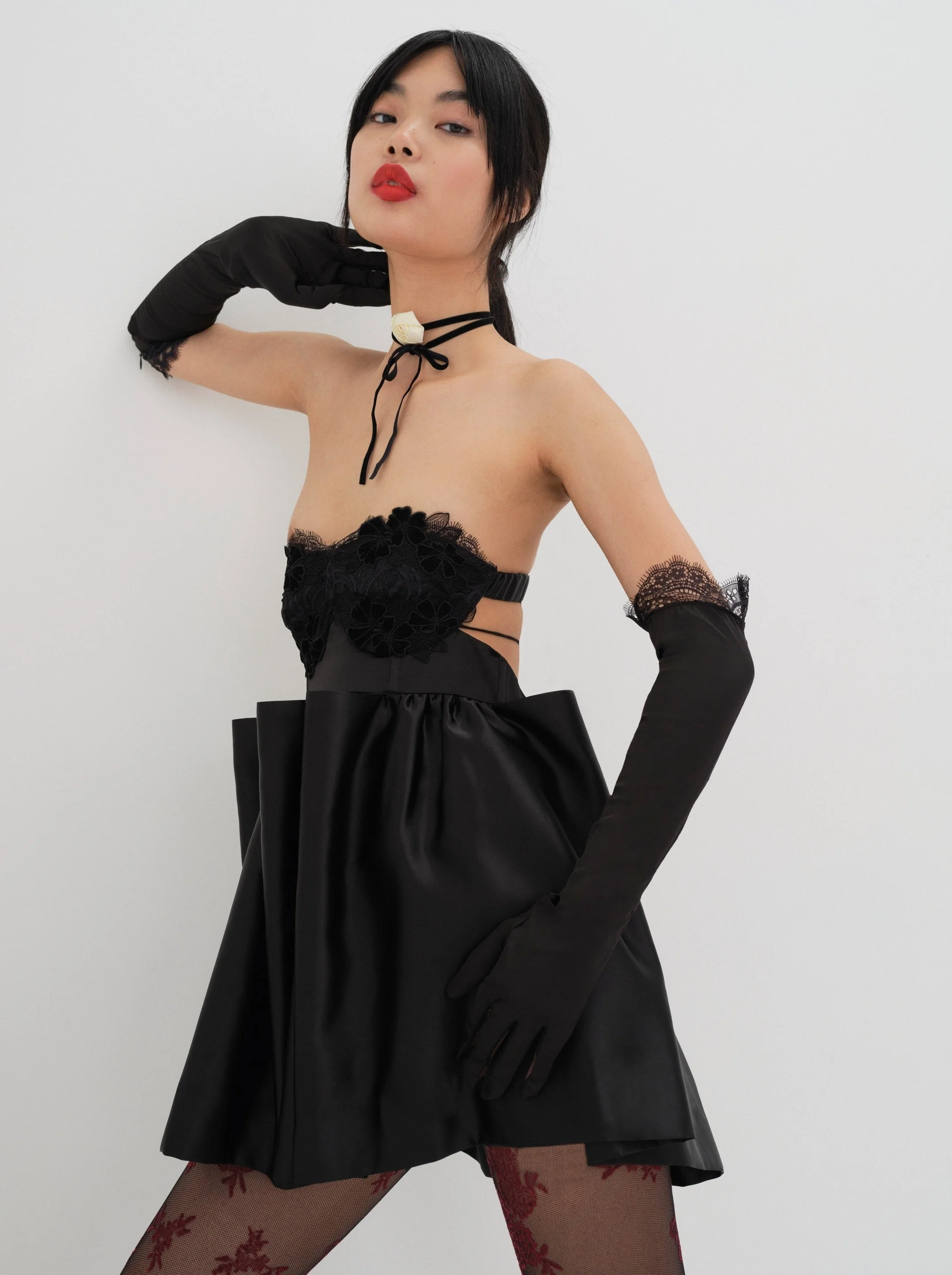 Tis the season to make a statement. Style Notes - Lace underwire cups - Side cut-out details - Large pleats along the waist. - Open back with skinny tie detail - Adjustable S-hook strap across back - Invisible zip closure - Partially lined - Gloves included