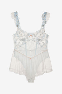 Embrace a romantic, ethereal aesthetic with the Winter Roses lingerie romper. Adorned with intricate embroidery, lace trims, rosettes, and bows throughout, this blue lace romper features underwire cups and flutter shorts for a whimsical look. Style Notes - Unlined - Built-in lace panty - Adjustable shoulder straps - 3-row hook and eye closure at back Fabric + Care - Crafted in 90% polyamide, 10% elastane - Lace is made of 100% polyester - Embroidery is made of 98% polyester, 2% other fiber - Mesh is made of 64% polyamide, 36% polyester - Gusset is made of 100% modal - Hand wash cold - Only non-chlorine bleach - Do not wring or twist - Line dry - Do not iron - Do not dry clean