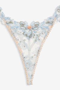 Embrace a romantic, ethereal aesthetic with the Winter Roses blue thong—a g string adorned with floral embroidery, lace trims, rosettes, and bows throughout. Pair it with the Style Notes - Unlined - Decorative elastic - Elasticated legline Fabric + Care - Crafted in 100% polyester - Embroidery is made of 98% polyester, 2% other fiber - Gusset is made of 100% modal - Hand wash cold - Only non-chlorine bleach - Do not wring or twist - Line dry - Do not iron - Do not dry clean