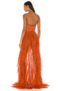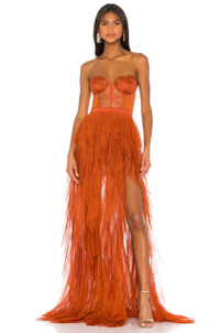 - Self: 100% poly Contrast 1: 100% nylon Contrast 2: 95% poly 5% spandex Contrast 3: 92% silk 8% spandex Lining: 82% nylon 18% spandex - Dry clean only - Attached bodysuit lining with bottom snap button closure - Hidden back zipper closure - Boned bodice with underwire cups - Tiered ruffle tulle hem - Neckline to shortest hem measures approx 23" and to longest hem approx 60" in length - Imported - A Revolve and For Love & Lemons exclusive with romantic lace and a flattering silhouette, making it a perfect guest of option. - Revolve Style No. FORL-WD734 - Manufacturer Style No. CD2080-HO19