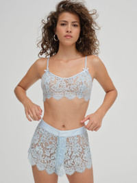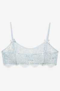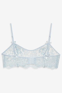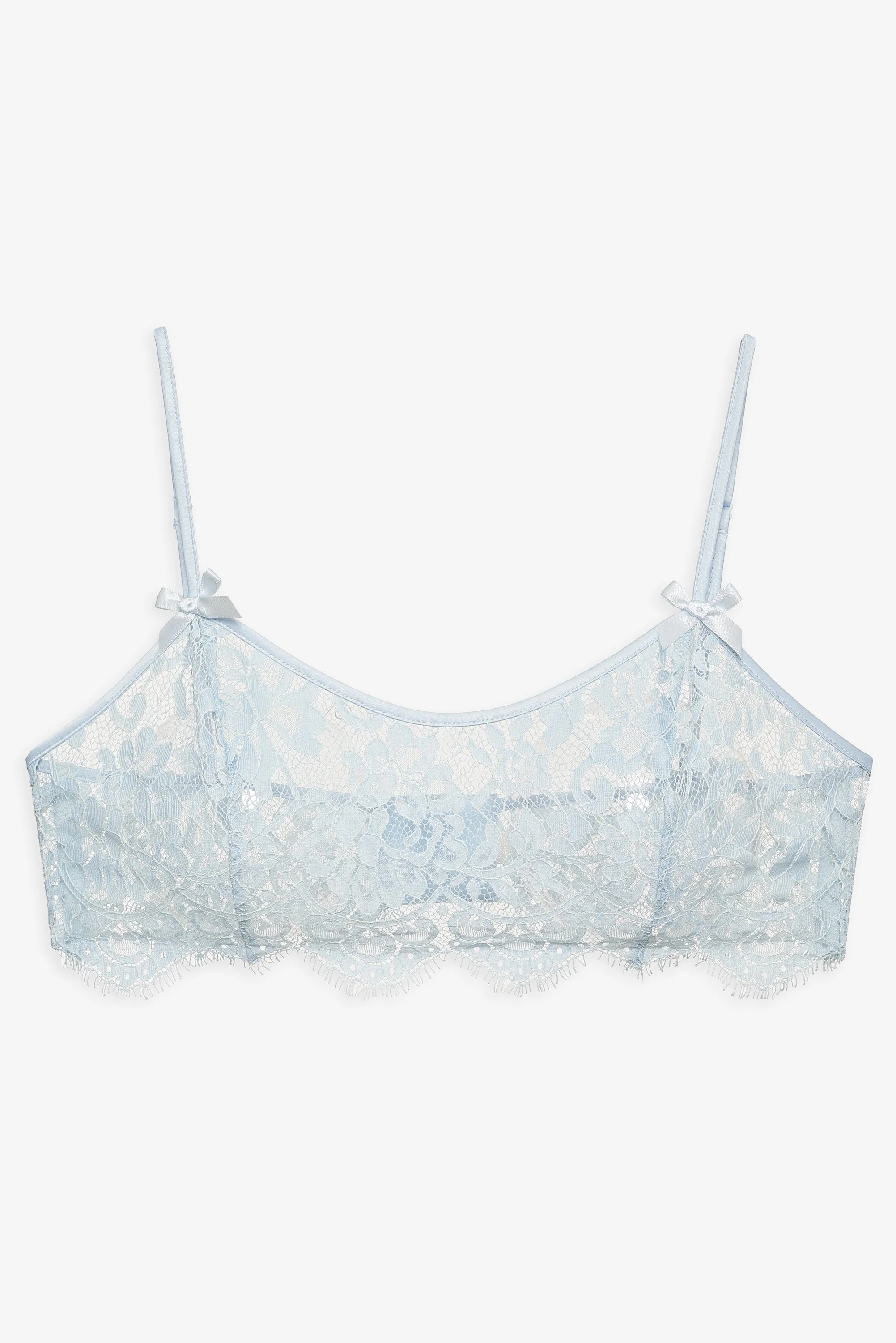 An ode to carefree afternoons and wildflower-strewn meadows, the Zeta lace bralette was made for sun-drenched days. Crafted in an all-over delicate floral lace, this blue bralette is adorned with decorative bows and sweet scallop trim. Style Notes - Unlined - No underwire - Adjustable shoulder straps - Hook and eye closure at center-back Fabric + Care - Crafted in 100% polyamide - Hand wash cold - Line dry - Do not dry clean
