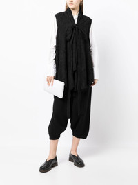 patterned jacquard jacket black stretch-wool patterned jacquard pussy-bow collar sleeveless asymmetric hem Made in Italy Composition Wool 77%, Polyamide 19%, Elastane 4% SIZE & FIT Model measurements Height 5 ft 11 in(1.8 m) Bust/Chest 28.34 in(72 cm) Hips 35.43 in(90 cm) Waist 23.62 in(60 cm) FittingInformation This piece fits true to size. We recommend you get your regular size Cut for a loose fit Made with a mid-weight stretch fabric Washing instructions Dry Clean Only