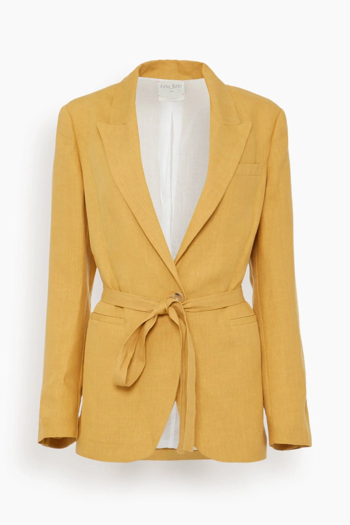 The Forte Forte Chic Linen Canvas Belted Jacket will be in your wardrobe for years to come. This blazer features a fitted waistband with a self tie in linen. Wear yours with the matching pants and loafers. FIT DESCRIPTION MODEL MEASUREMENTS - Fits true to size, take your normal size - Blazer - Single button closure - Self tie waistband - Relaxed fit - 100% Linen - Rayna is wearing a size 0/ XS - Bust: 34” - Waist: 24” - Hips: 32” - Height: 5’8.5”