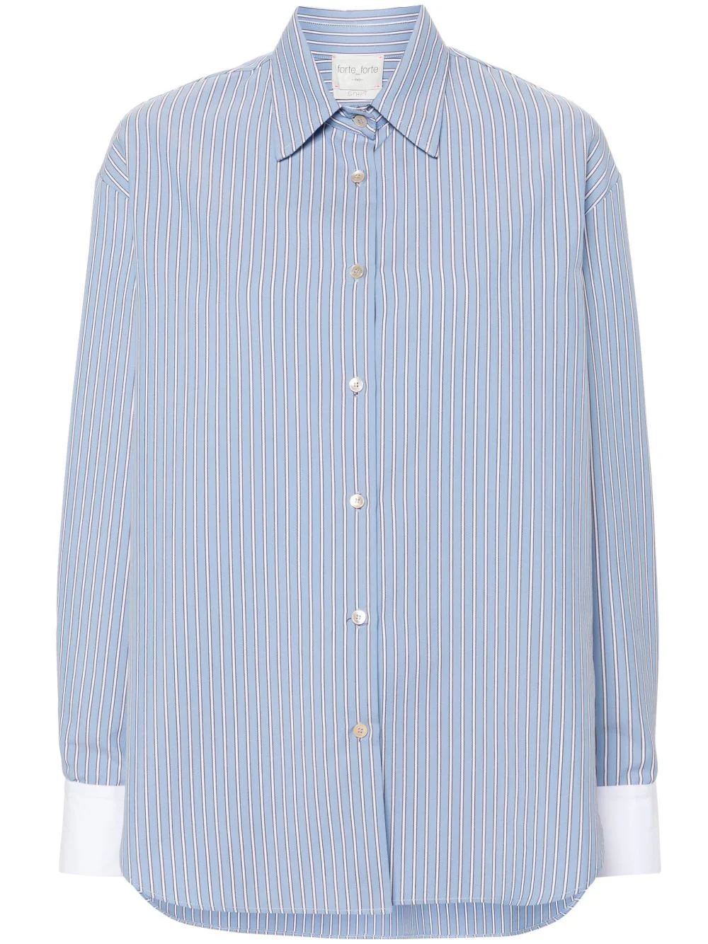 contrasting-cuffs striped shirt Highlights - Cornflower blue/black/white - Cotton blend - Vertical stripe pattern - Pointed flat collar - Long sleeves with contrasting buttoned cuffs - Pleat detailing to the sleeve and rear - Short side slits - Curved hem - Front button fastening Made in Italy Composition Cotton 55%, Polyester 45% SIZE & FIT Model measurements Height 5 ft 10 in(1.78 m) Bust/Chest 33.07 in(84 cm) Hips 36.61 in(93 cm) Waist 24.8 in(63 cm) FittingInformation Designed to be unstructured, offering a loose fit throughout Made from a midweight non-stretch fabric This piece fits true to size – take your usual size Washing instructions Machine Wash