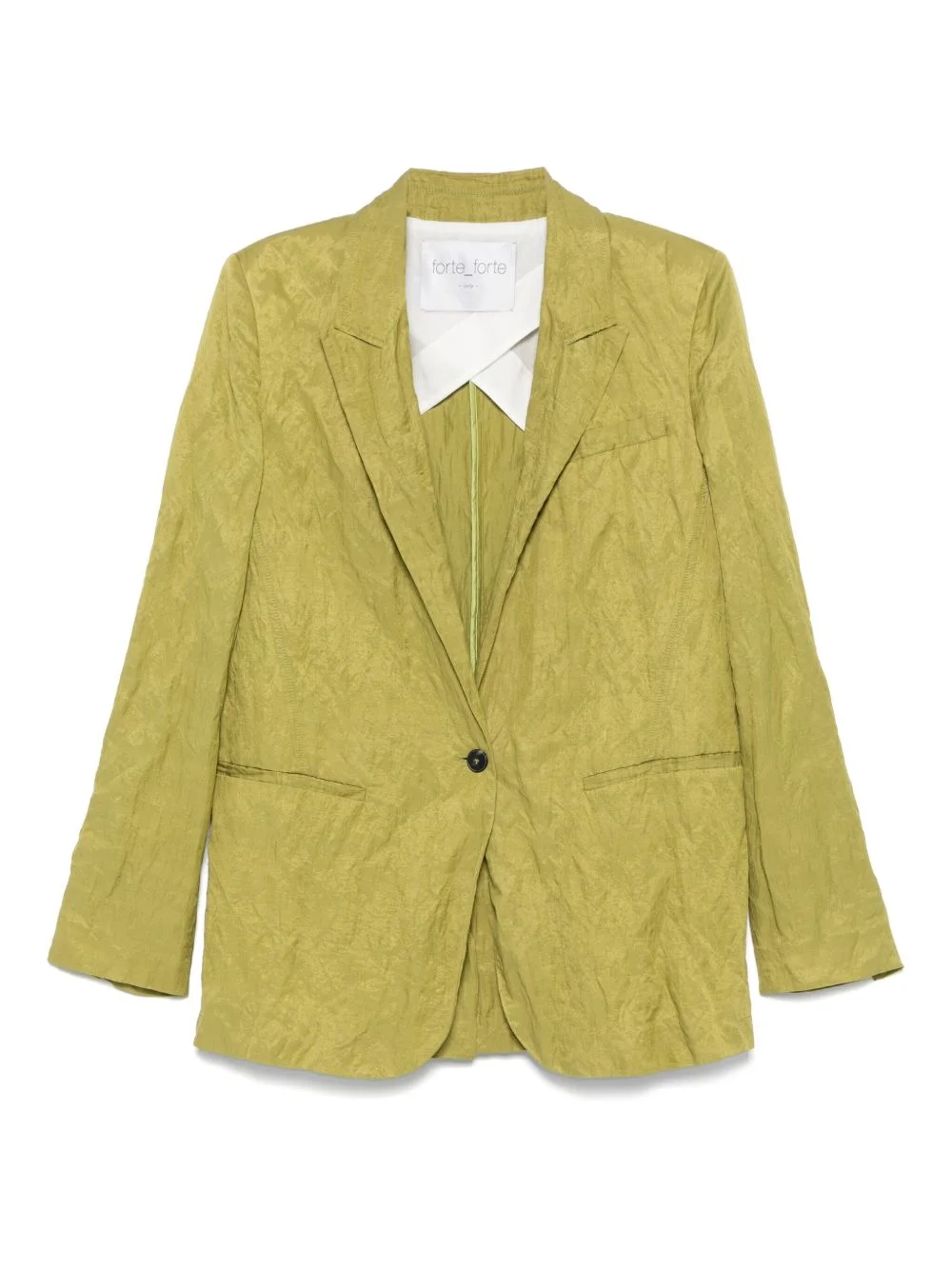 crinkled blazer Highlights - Avocado green - Front button fastening - American rear vent - Chest welt pocket - Shoulder pads Made in Italy Composition Outer: Cotton 51%, Viscose 39%, Metallised Fibres 10% Lining: Cupro 100%, Cotton 100% SIZE & FIT Model measurements Height 5 ft 10 in(1.79 m) Bust/Chest 35.43 in(90 cm) Hips 35.03 in(89 cm) Waist 25.19 in(64 cm) FittingInformation Designed for a slim fit that sits just away from the body offering a close yet comfortable fit The internal shoulder pads offer a structured shape Made from a midweight non-stretch fabric Washing instructions Dry Clean Only
