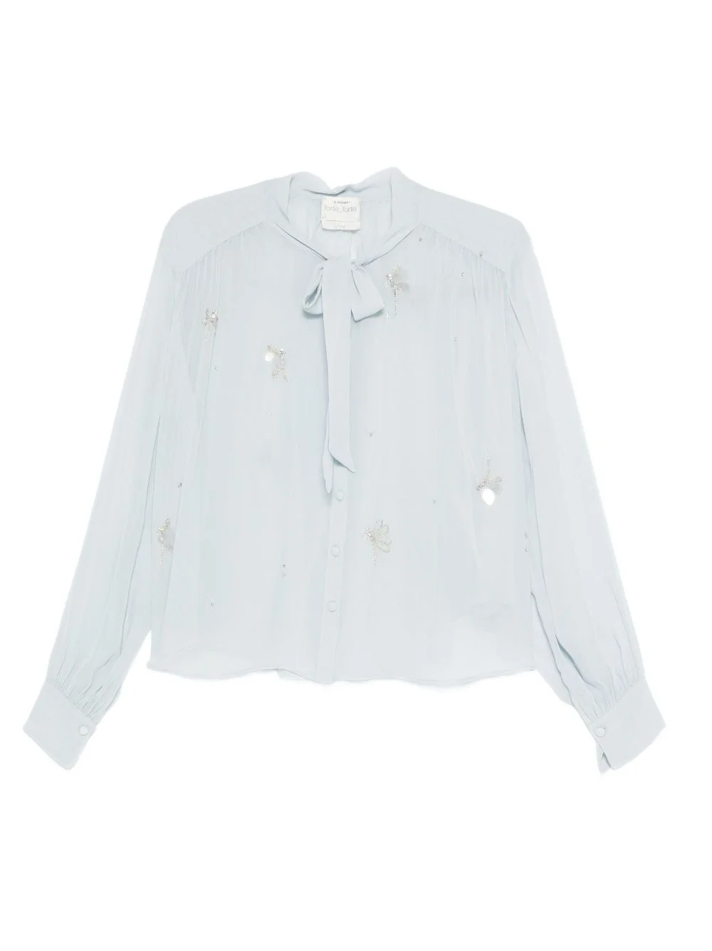 crystal-embellished tie-neck shirt Highlights - Light blue - Tie neck - Long sleeves - Button fastening - Crystal embellishments Imported Composition Viscose 100% SIZE & FIT Model measurements Height 5 ft 9 in(1.76 m) Bust/Chest 31.49 in(80 cm) Hips 35.03 in(89 cm) Waist 24.8 in(63 cm) Washing instructions Read Manufacturer Guidelines