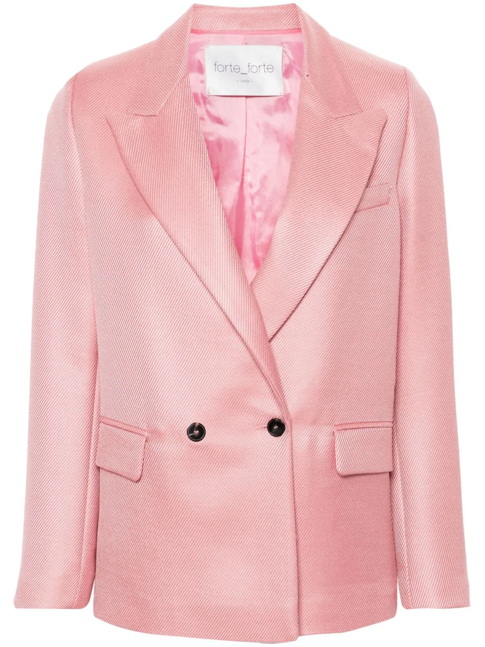 double-breasted striped blazer Highlights - Rose pink - Virgin wool blend - Diagonal stripe pattern - Patterned jacquard - Peak lapels - Shoulder pads - Long sleeves with buttoned cuffs - Chest welt pocket - Two front flap pockets - Straight hem - Full lining - Double-breasted button fastening Made in Italy Composition Virgin Wool 74%, Viscose 26% SIZE & FIT Model measurements Height 5 ft 10 in(1.78 m) Bust/Chest 33.07 in(84 cm) Hips 36.61 in(93 cm) Waist 24.8 in(63 cm) Washing instructions Dry Clean Only