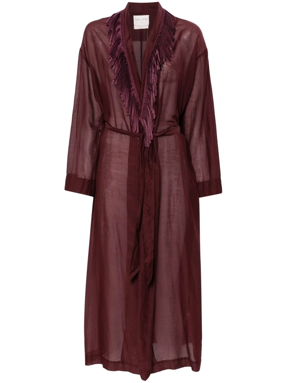 fringed-detailing coat Highlights - Burgundy - Shawl collar - Long sleeves - Detachable waist belt Made in Italy Composition Cotton 70%, Silk 30% SIZE & FIT Model measurements Height 5 ft 10 in(1.79 m) Bust/Chest 31.88 in(81 cm) Hips 35.43 in(90 cm) Waist 23.62 in(60 cm) FittingInformation Designed to be unstructured, offering a loose fit throughout The tie fastening gives an adaptable and personalised fit Made from a lightweight non-stretch fabric Washing instructions Hand Wash
