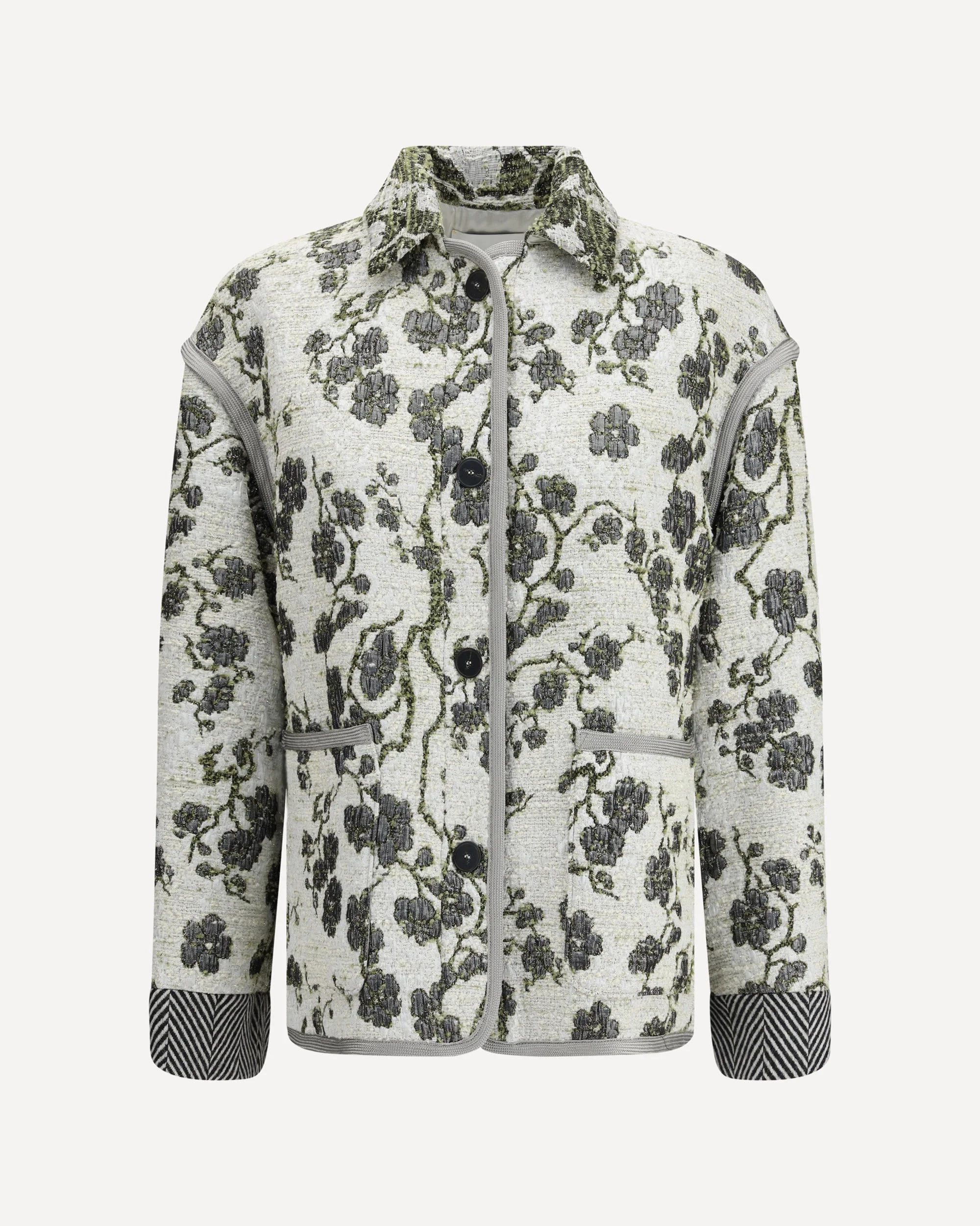 The “La Lune en Fleur” jacquard Jacket by forte_forte evokes the charm of vintage wardrobes through a contemporary lens. Crafted from fine jacquard fabric woven with silver threads, it features the delicate “La Lune en Fleur” motif that brings light and texture to the piece. Glossy trimmings highlight its artisanal craftsmanship, while the refined, feminine silhouette drapes gracefully over the body. A poetic fusion of tradition and modernity, embodying the timeless elegance of the brand. DETAILS - Sku: 14308MYCOAT_F48M3057 - Season: AW25 - Fit: Regular - Composition: GENERAL 33% Polyamide 35% Polyester 30% Cotton 2% Acrylic - MADE IN ITALY
