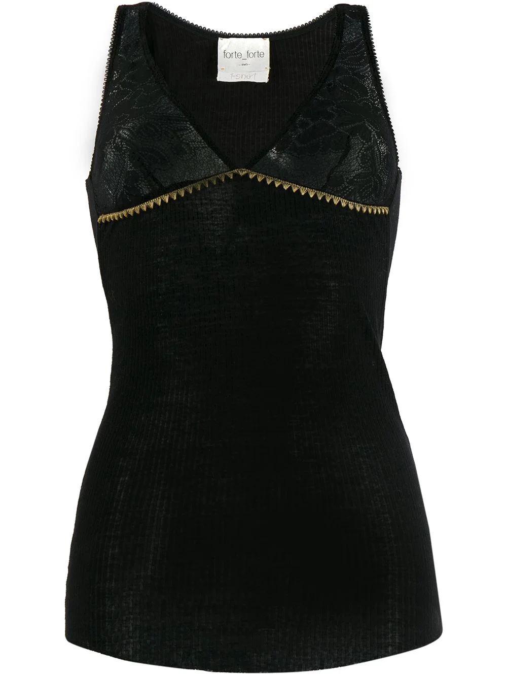 lace panel tank top Black cotton-linen blend lace panel tank top from Forte Forte featuring a v-neck, a sleeveless design, a ribbed design, embroidered details and a slim fit. Made in Italy Composition Linen/Flax 50%, Cotton 50% SIZE & FIT Model measurements Height 5 ft 9 in(1.76 m) Bust/Chest 31.49 in(80 cm) Hips 35.03 in(89 cm) Waist 23.62 in(60 cm) Washing instructions Hand Wash