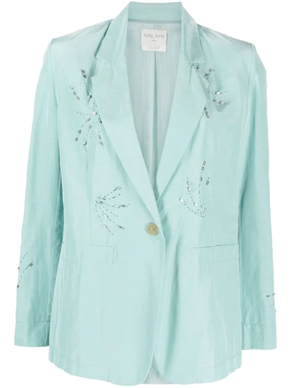 rhinestone-embellished lightweight blazer Highlights - Aqua blue - Lightweight construction - Notched lapels - Front button fastening - Rhinestone embellishment - Decorative stitching - Shoulder pads - Long sleeves - Buttoned cuffs - Straight hem - Two front welt pockets - Full lining Made in Italy Composition Polyester 52%, Cotton 48% SIZE & FIT Model measurements Height 5 ft 10 in(1.77 m) Bust/Chest 31.1 in(79 cm) Hips 34.64 in(88 cm) Waist 24.8 in(63 cm) FittingInformation Designed for a relaxed fit, this piece allows for comfort and movement when worn Made from a lightweight non-stretch fabric This piece fits true to size – take your usual size Washing instructions Machine Wash
