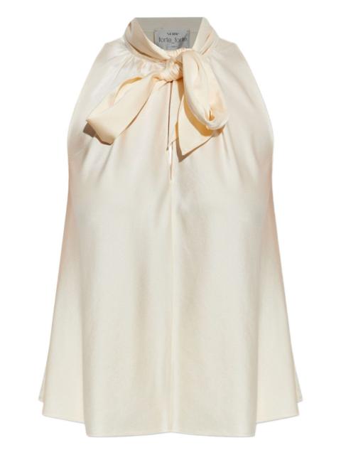 satin top Highlights - Cyan blue - Halterneck - Pussy-bow collar - Sleeveless - Cropped Made in Italy Composition Silk 94%, Elastane 6% SIZE & FIT Model measurements Height 5 ft 11 in(1.81 m) Bust/Chest 33.07 in(84 cm) Hips 36.61 in(93 cm) Waist 24.4 in(62 cm) FittingInformation Designed for a relaxed fit, this piece allows for comfort and movement when worn Made from a lightweight stretch fabric, this piece offers elasticity and flexibility when worn Washing instructions Dry Clean Only