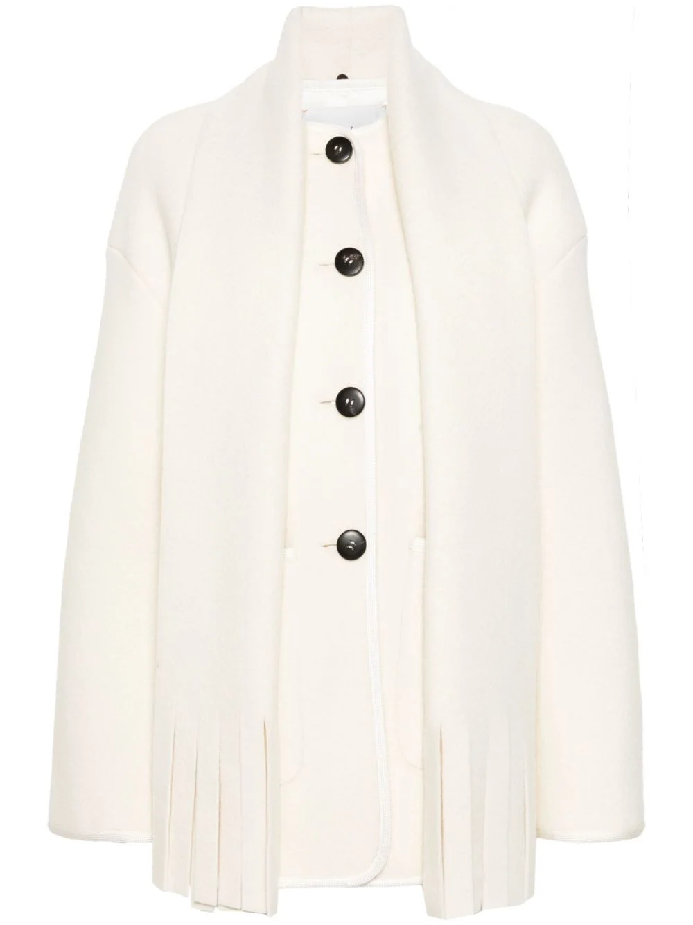 scarf-detail coat Highlights - Ivory white - Wool blend - Brushed effect - Scarf detailing with fringed edge - Rounded collar - Long sleeves - Two front patch pockets - Finished edge - Straight hem - Front button fastening Made in Italy Composition Wool 80%, Polyamide 20% SIZE & FIT Model measurements Height 5 ft 10 in(1.78 m) Bust/Chest 33.07 in(84 cm) Hips 36.61 in(93 cm) Waist 24.8 in(63 cm) FittingInformation Designed to be unstructured, offering a loose fit throughout The detachable panel offers the preference for a different fit Made from a midweight non-stretch fabric This piece fits true to size – take your usual size Washing instructions Dry Clean Only