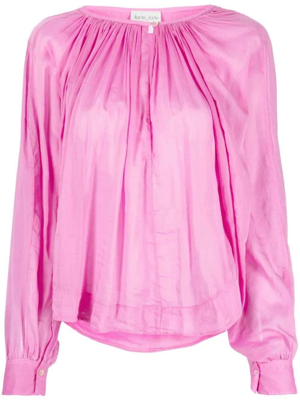 semi-sheer pleated blouse Made in Italy from a delicate blend of cotton and silk to a semi-sheer design, this blouse from Forte Forte is defined by its pleated flowy silhouette. It's rendered here in a vibrant pin hue. Highlights - Bubblegum pink - Cotton-silk blend - Semi-sheer construction - Pleat detailing - Round neck - Button fastening at the shoulder - Buttoned-cuff sleeves - Curved hem Made in Italy Composition Viscose 100%, Cotton 70%, Silk 30% SIZE & FIT Model measurements Height 5 ft 10 in(1.77 m) Bust/Chest 31.1 in(79 cm) Hips 34.64 in(88 cm) Waist 24.8 in(63 cm) FittingInformation Designed to be unstructured, offering a loose fit throughout Made from a lightweight non-stretch fabric This piece fits true to size – take your usual size Washing instructions Machine Wash
