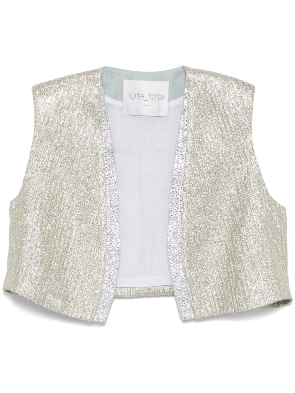 striped gilet Highlights - Sky blue - Open front - Crystal embellishment - Full lining Made in Italy Composition Polyester 44%, Cotton 30%, Metallized Polyester 10%, Viscose 7%, Acrylic 7%, Other fibres 2% SIZE & FIT Model measurements Height 5 ft 10 in(1.79 m) Bust/Chest 31.88 in(81 cm) Hips 35.43 in(90 cm) Waist 23.62 in(60 cm) FittingInformation Designed for a relaxed fit, this piece allows for comfort and movement when worn Cropped in length Made from a midweight non-stretch fabric Washing instructions Dry Clean Only