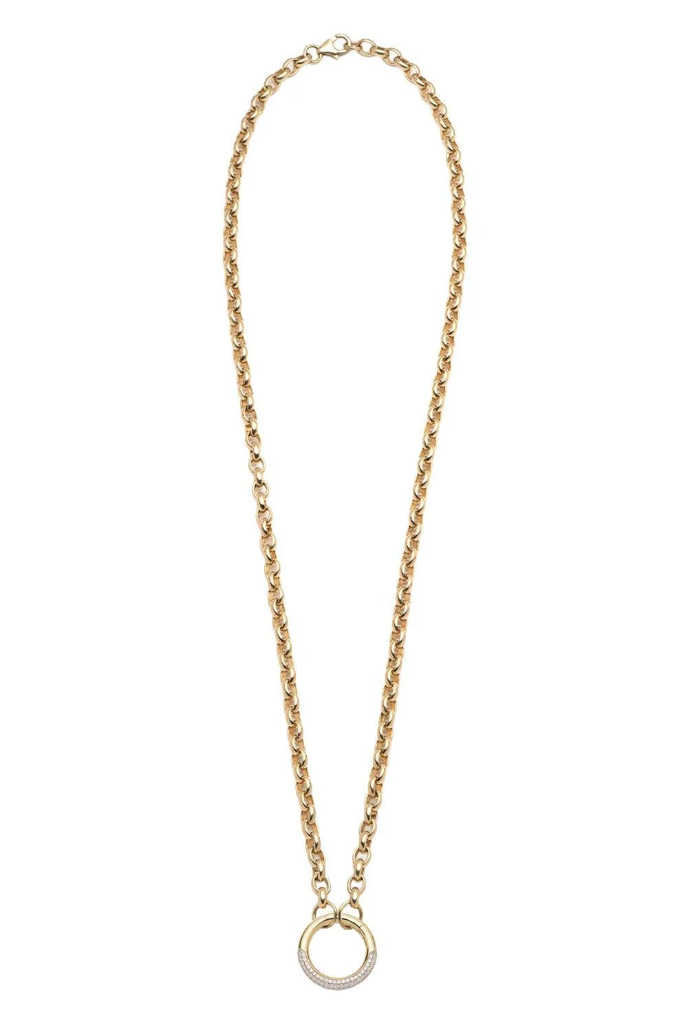 DETAILS AND INSIGHT Foundrae diamond pave heavy belcher open chain in yellow gold. Crafted in 18K yellow gold with pave diamonds, Foundrae's Large Belcher Open Chain Necklace is 18" in length and features a chubby center annex link that opens to add the medallions of your choice. Use this chain to tell your personal jewelry story with pendants and medallions that are meaningful to you. 18K Yellow Gold 0.44ctw Diamnds Heavy Belcher Chain gauge is 5mm, Large open link measures 23 mm diameter 18" L Style CO0107-NTA-YG-18-CP113