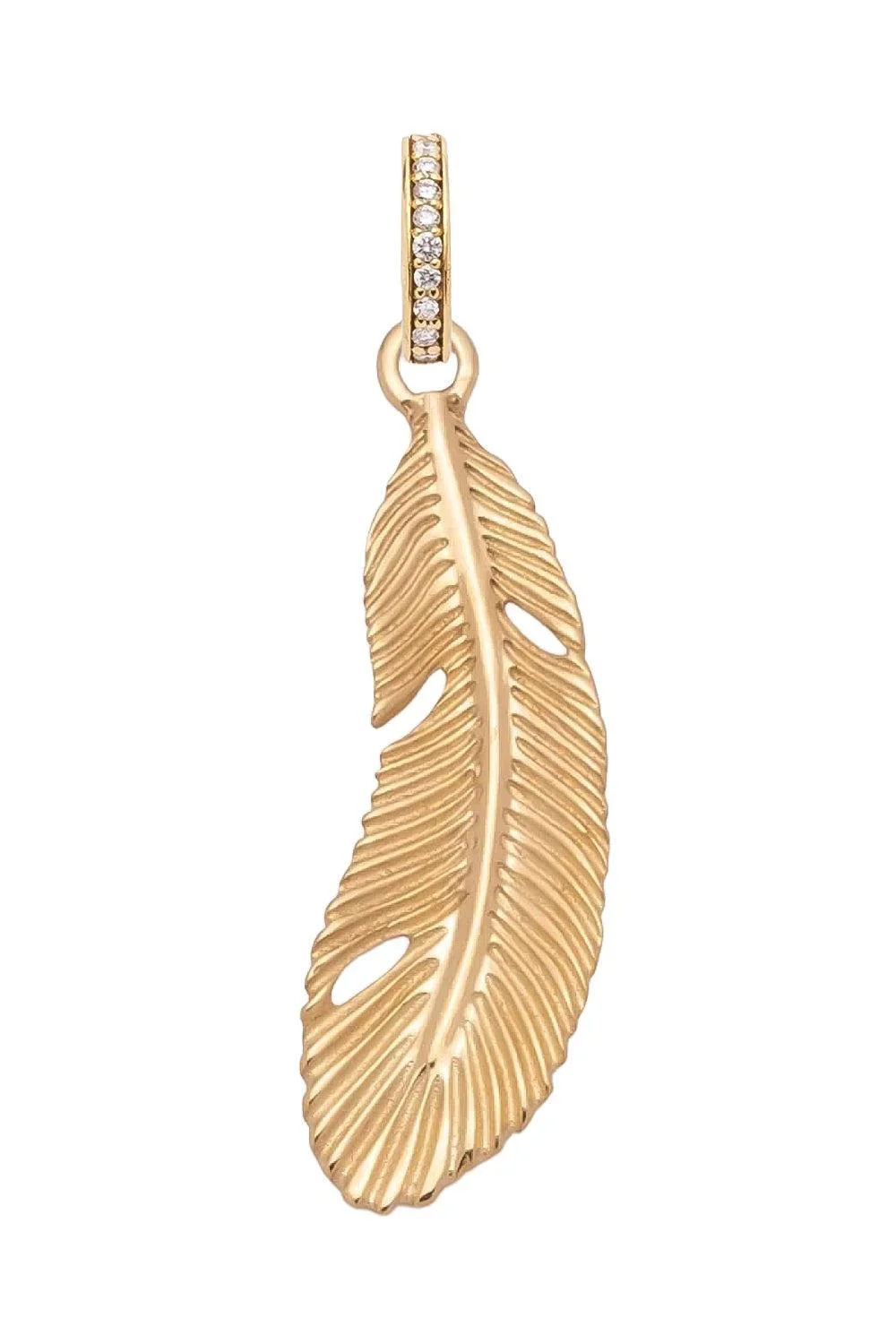 DETAILS AND INSIGHT Foundrae feather small pendant in yellow gold. Crafted in 18K yellow gold, Foundrae's Feather Small Pendant represents the Latin word vivacitas, or life force. The vivacity tenet encourages us to live a life filled with exploration, discovery, and learning. The feather symbolizes wings so we may take flight and soar even in the most daunting of times. If not now, when? This pendant is complimented by their annex link. Use this piece as a tool to build your story and add your Feather Small Pendant to any necklace. 18K Yellow Gold 34.6 x 11.2mm Style MG0070-FEA-YG-CL30