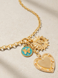 Foundrae's intricate jewelry is imbued with a range of spiritual and mystical symbols, so every piece has a story to tell. Handcrafted from 18-karat gold, this necklace is strung with a diamond-encrusted heart symbolizing the seven classic types of love, a compass for a reminder that all change starts from within and an enameled butterfly charm that represents daydreaming. The mixed belcher chain makes customizing so easy - remove some or add more as you see fit.