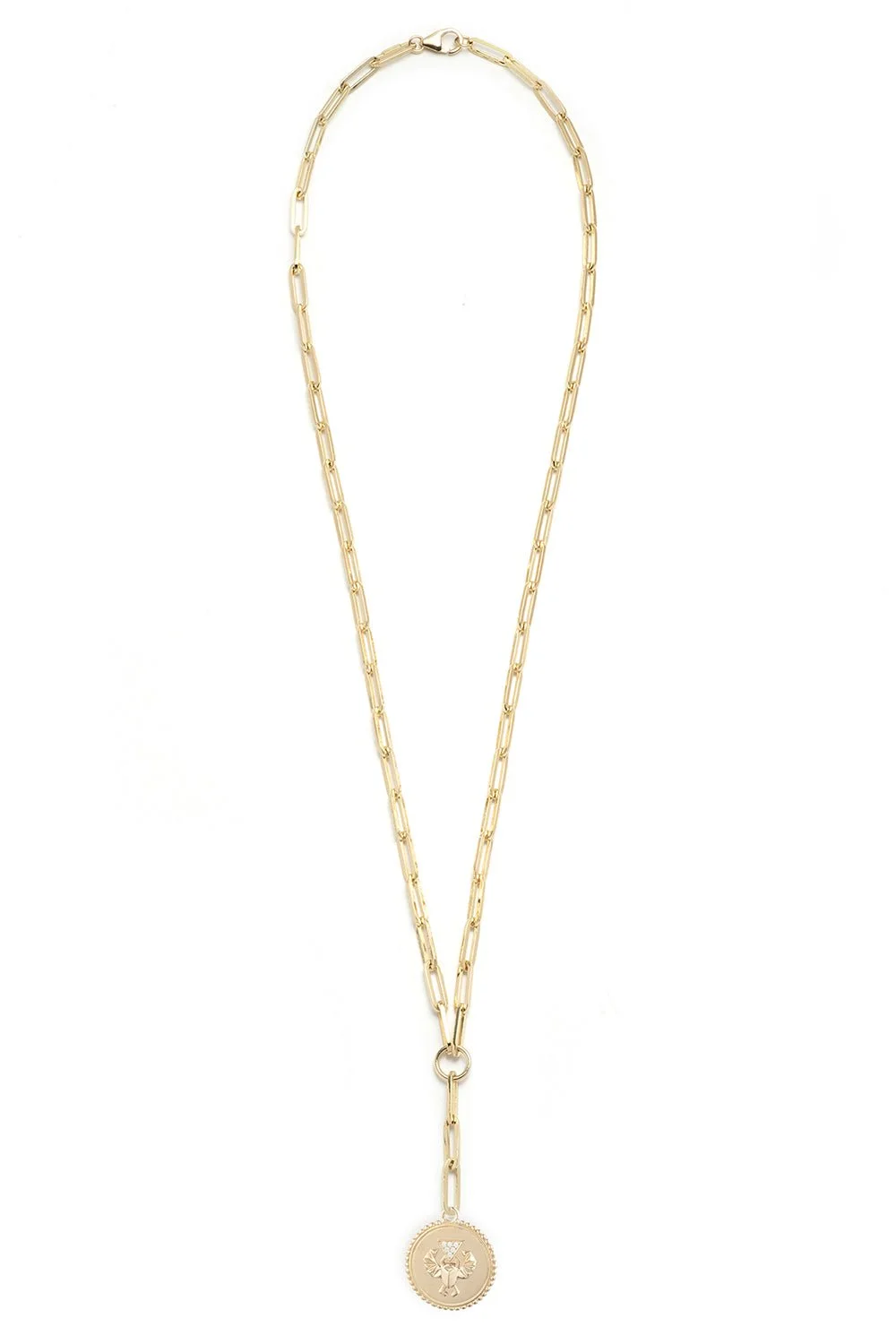 DETAILS AND INSIGHT Foundrae protection refined clip extension chain necklace in yellow gold. 18k Yellow Gold .023ctw Diamonds 15mm Medallion, 18" L Style M4-PROTECTION